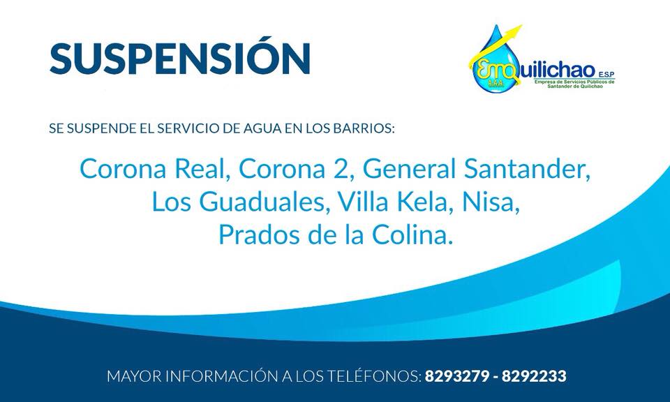 Debido a trabajos de empalme de tuberías de 8 pulgadas en Brisas de Santa Clara, se suspende el servicio de acueducto en los siguientes barrios. Nuestros funcionarios se encuentran realizando las labores necesarias para restablecer el servicio en la brevedad posible. ... Leer más