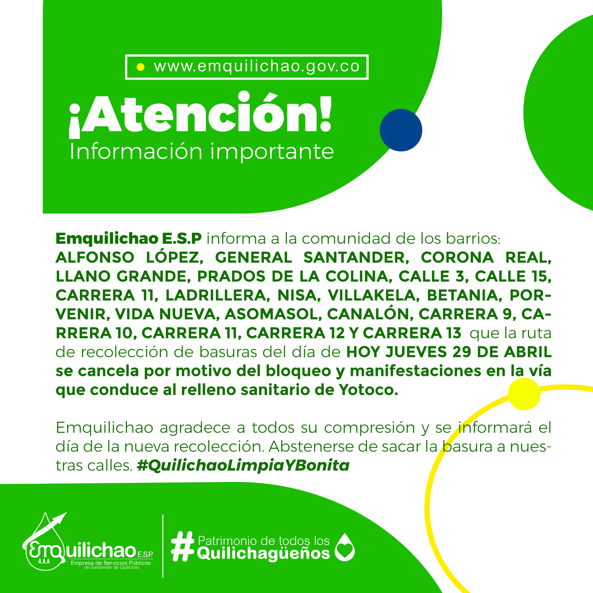 Se cancela la ruta de recolección de basura para el día 29 de Abril de 2021