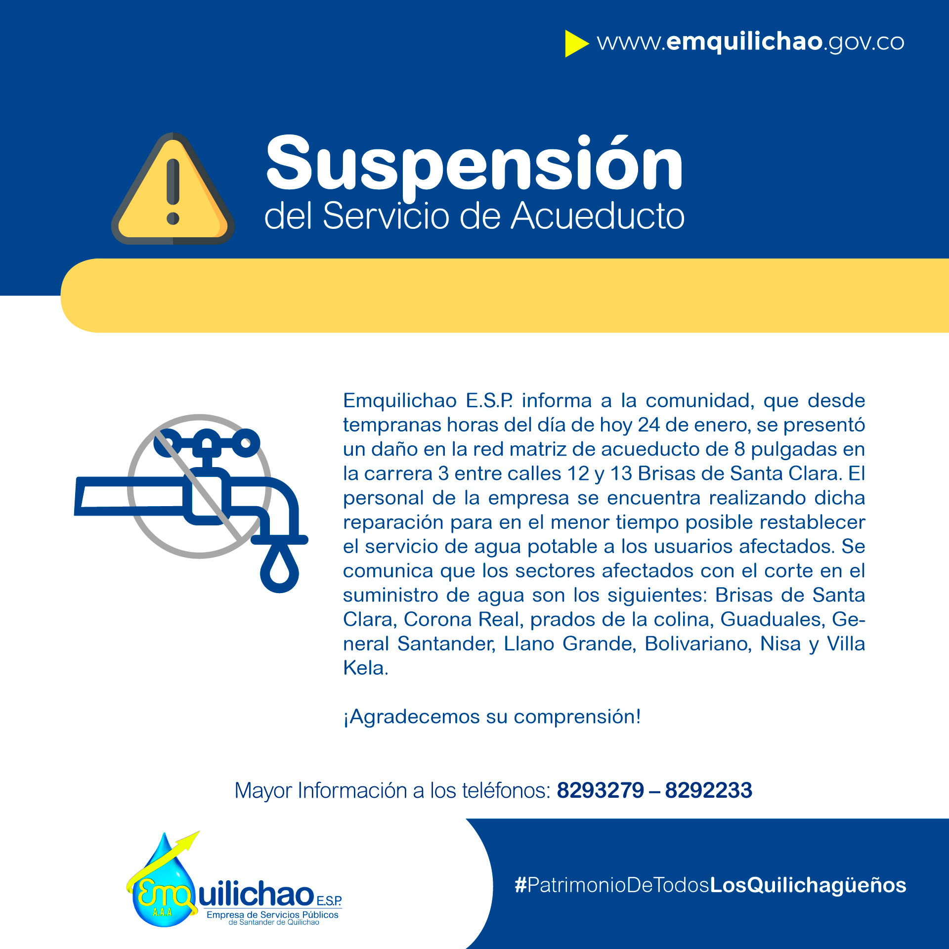 Emquilichao E.S.P informa a la comunidad de los barrios:ALFONSO LÓPEZ, GENERAL SANTANDER, CORONA REAL, LLANO GRANDE, PRADOS DE LA COLINA, CALLE 3, CALLE 15, CARRERA 11, LADRILLERA, NISA, VILLAKELA, BETANIA, PORVENIR, VIDA NUEVA, ASOMASOL, CANALÓN, CARRERA 9, CARRERA 10, CARRERA 11, CARRERA ... Leer más