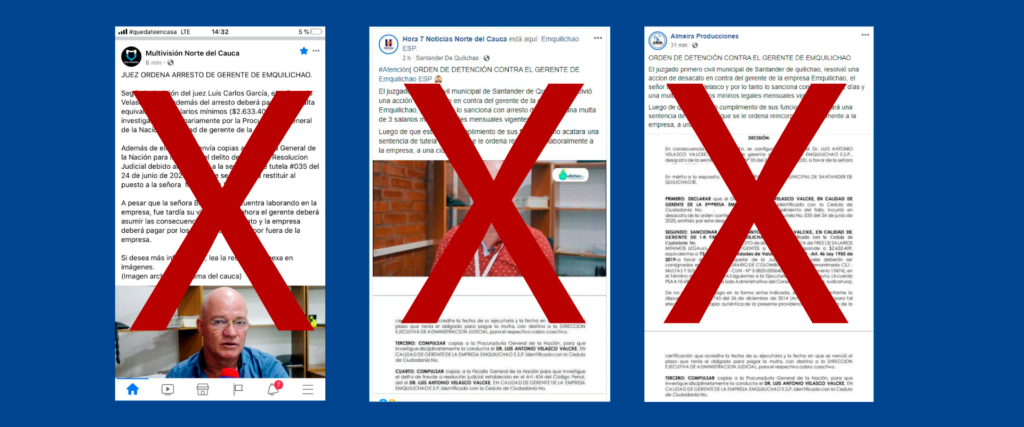 La publicación de la “noticia” según la cual el Juzgado Primero Civil Municipal de Santander de Quilichao resolvió un incidente de desacato a una tutela en contra del gerente de la empresa Emquilichao E.S.P., Luis Antonio Velasco, sancionándolo con arresto de dos días y una multa de tres salarios mininos legales mensuales vigentes, puso en evidencia la falta de investigación, verificación y contraste de la información con las fuentes por parte de los periodistas que cayeron en la falta de rigor profesional, pues la parte publicada es apenas la primera instancia de todo un proceso que al final se sentenció en beneficio del gerente de Emquilichao E.S.P., a quien antes de las publicaciones ya le habían revocado legalmente las sanciones que, sin embargo, se les dio engañoso despliegue en las redes sociales.