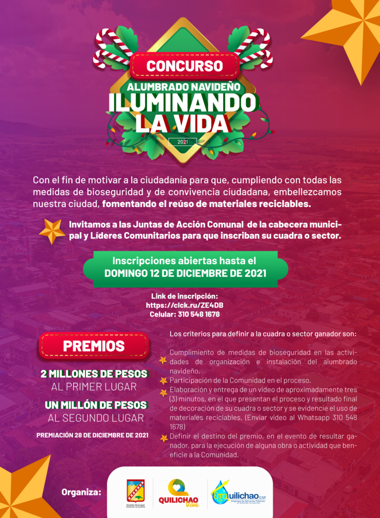 Participa en el concurso de alumbrado navideño ‘Iluminando La Vida’ 2021. Invitamos a las Juntas de Acción Comunal y Líderes Comunitarios para que inscriban su cuadra o sector, con el desarrollo de este concurso se pretende motivar a la ciudadanía para que, cumpliendo todas las medidas de bioseguridad y de convivencia ciudadana, embellezcamos nuestra ciudad, fomentando el reúso de materiales reciclables en esta temporada navideña.