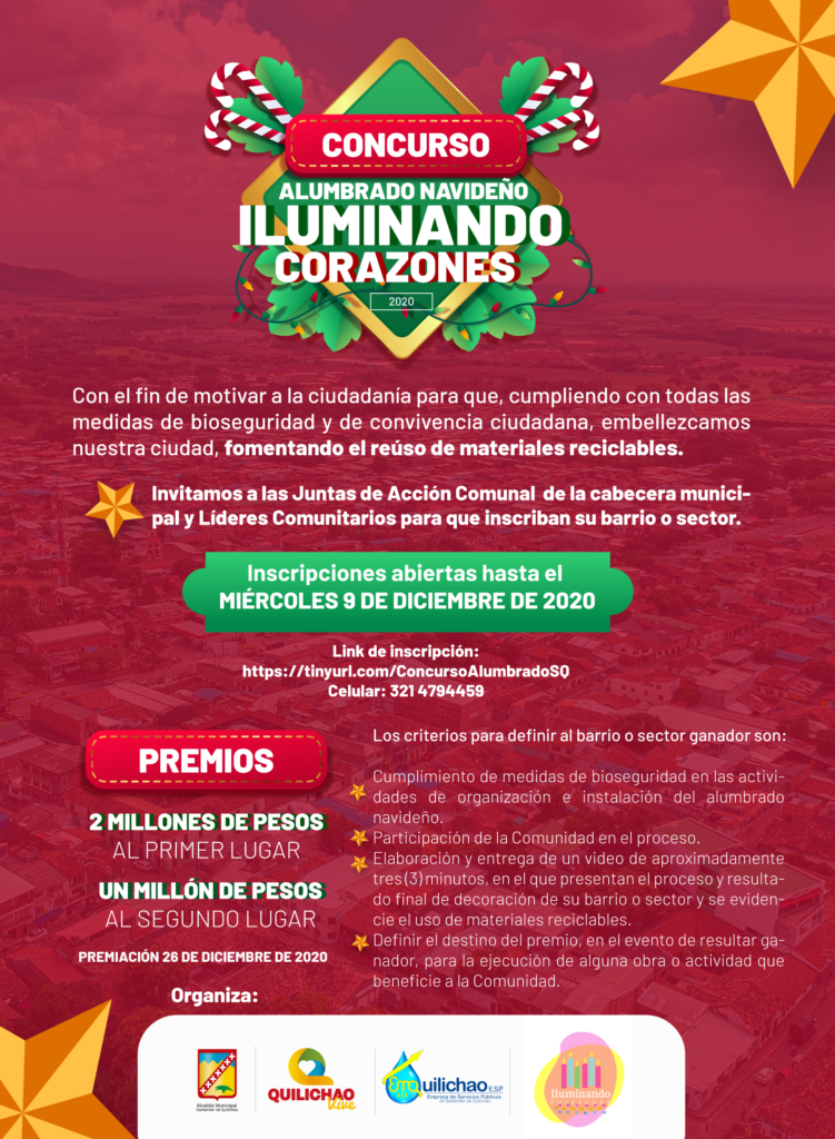 Se invita a los directivos de las Juntas de Acción Comunal y Líderes Comunitarios para que inscriban su barrio o sector al Concurso de alumbrado navideño ‘Iluminando Corazones’ 2020, organizado por la Administración Municipal, Emquilichao E.S.P. y la iniciativa Iluminando Corazones.