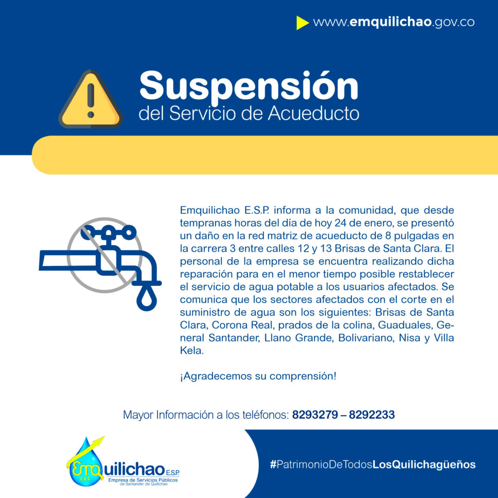 #Comunicado | Emquilichao E.S.P. informa a la comunidad, que desde tempranas horas del día de hoy 24 de enero, se presentó un daño en la red matriz de acueducto de 8 pulgadas en la carrera 3 entre calles 12 y 13 Brisas de Santa Clara. El personal de la empresa se encuentra realizando dicha reparación para en el menor tiempo posible restablecer el servicio de agua potable a los usuarios afectados.