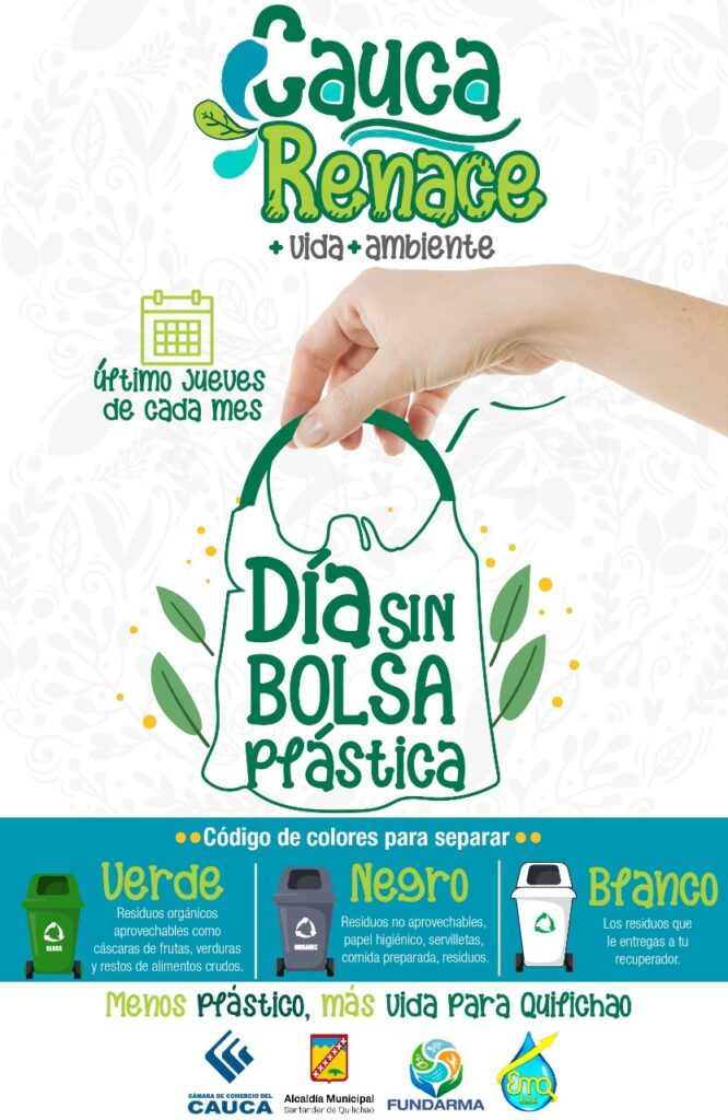El día de hoy jueves 26 de agosto 2021, se está llevando a cabo la primera jornada del ‘Día Sin Bolsa’ en droguerías y farmacias en el marco de la campaña Cauca Renace: +vida +ambiente. Una estrategia de sensibilización para evitar la contaminación con materiales plásticos y adoptar medidas eco sostenibles. Compra en Santander de Quilichao utilizando bolsas biodegradables o reutilizables, así apoyas al comercio y al medio ambiente.