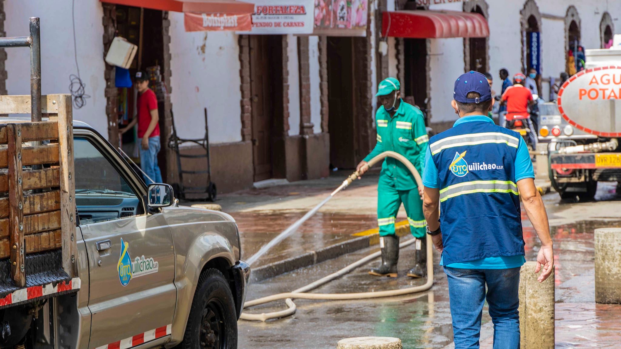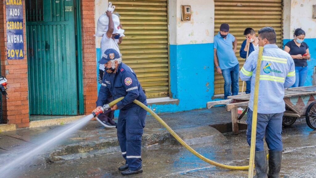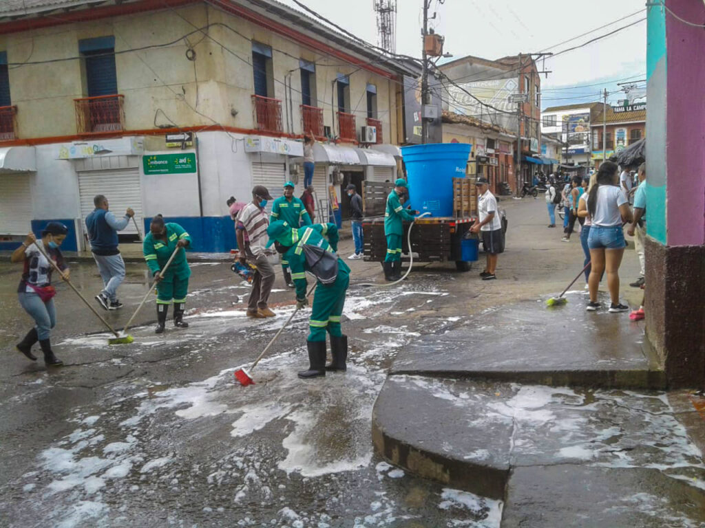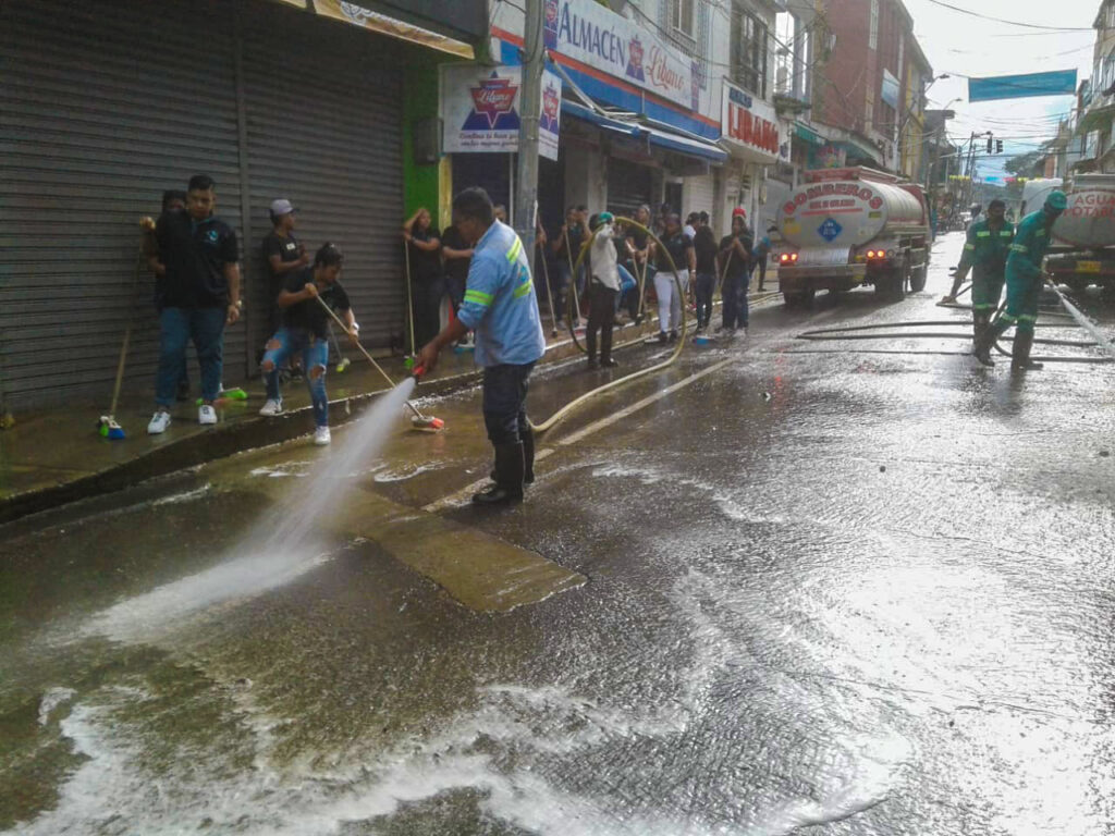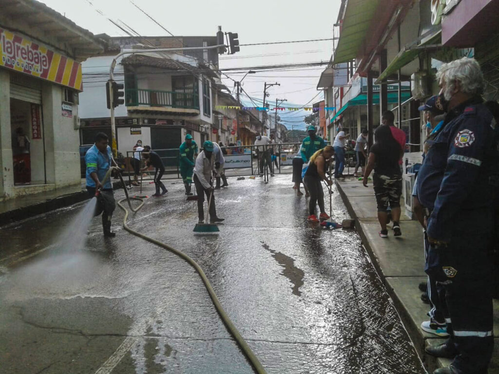 Con el compromiso y el trabajo en equipo, la Administración Municipal, Emquilichao E.S.P, Merquilichao, el Cuerpo de Bomberos y comerciantes realizaron una nueva jornada de limpieza, lavado y desinfección de calles, fachadas y andenes alrededor de la galería municipal al igual que en establecimientos comerciales concurridos.