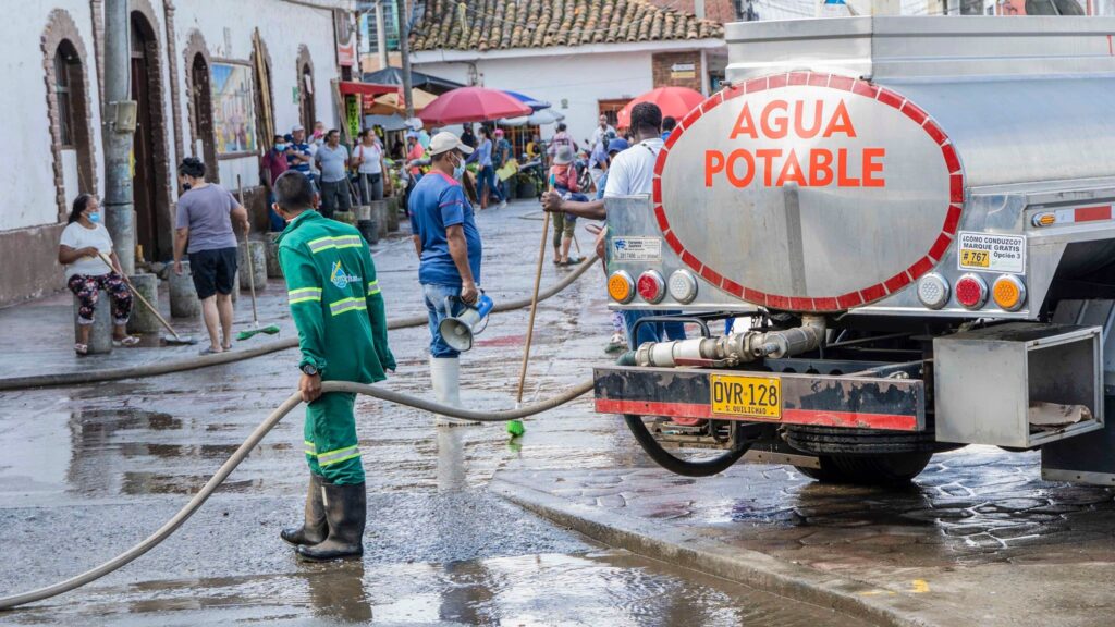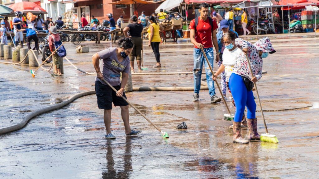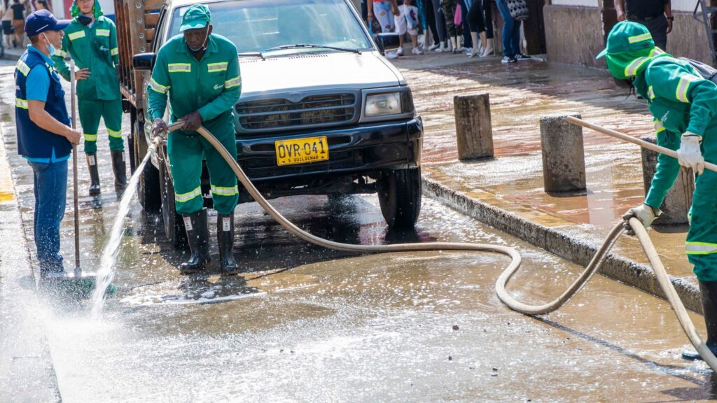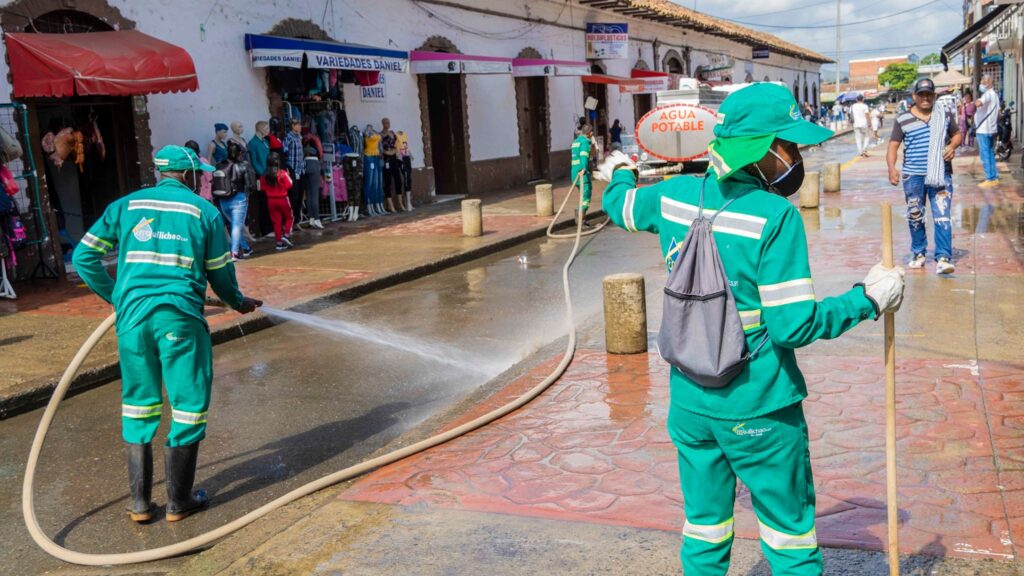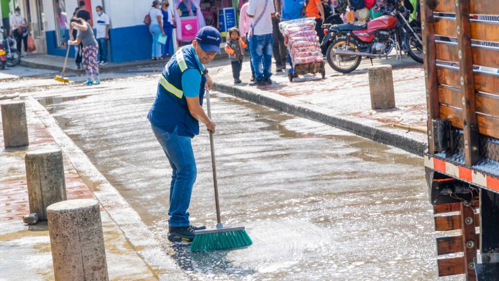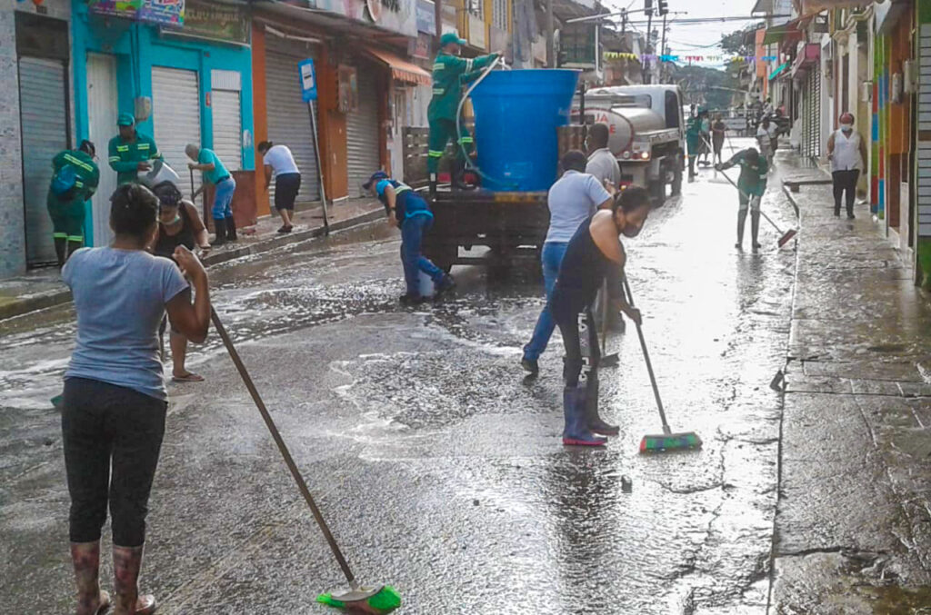 Con el compromiso y el trabajo en equipo, la Administración Municipal, Emquilichao E.S.P, Merquilichao, el Cuerpo de Bomberos y comerciantes realizaron una nueva jornada de limpieza, lavado y desinfección de calles, fachadas y andenes alrededor de la galería municipal al igual que en establecimientos comerciales concurridos.