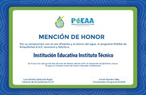EMQUILICHAO E.S.P. a través del Programa de Uso Eficiente y Ahorro del Agua, hizo realizó un merecido reconocimiento a la Institución Educativa Cauca, Los Samanes, Francisco José de Caldas, San José, Rafael Tello y al Instituto Técnico por su enorme compromiso con el uso eficiente y ahorro del agua.